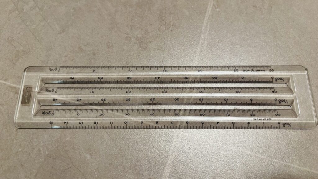三角定規でも線引きはできますが、平面図一つずつとなってしまうため手間がかかるので、このサイズの定規があると地味ですが楽になります。