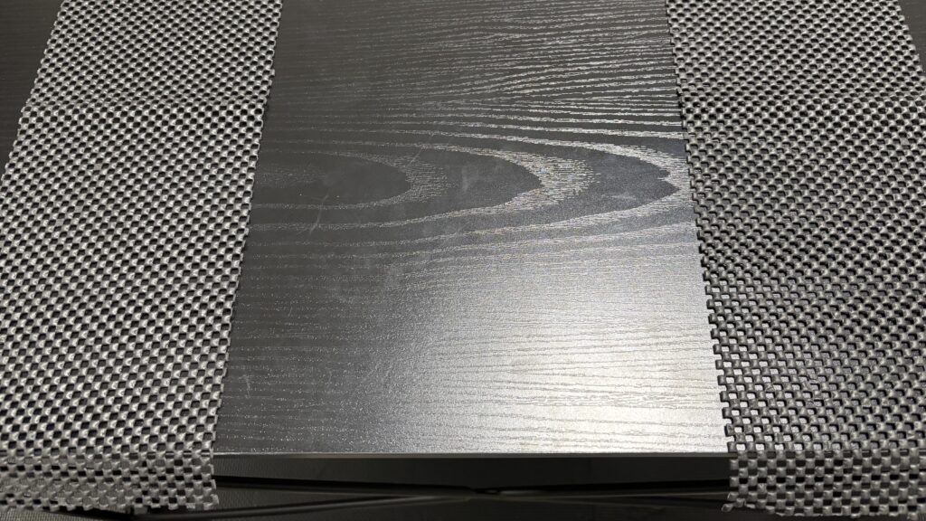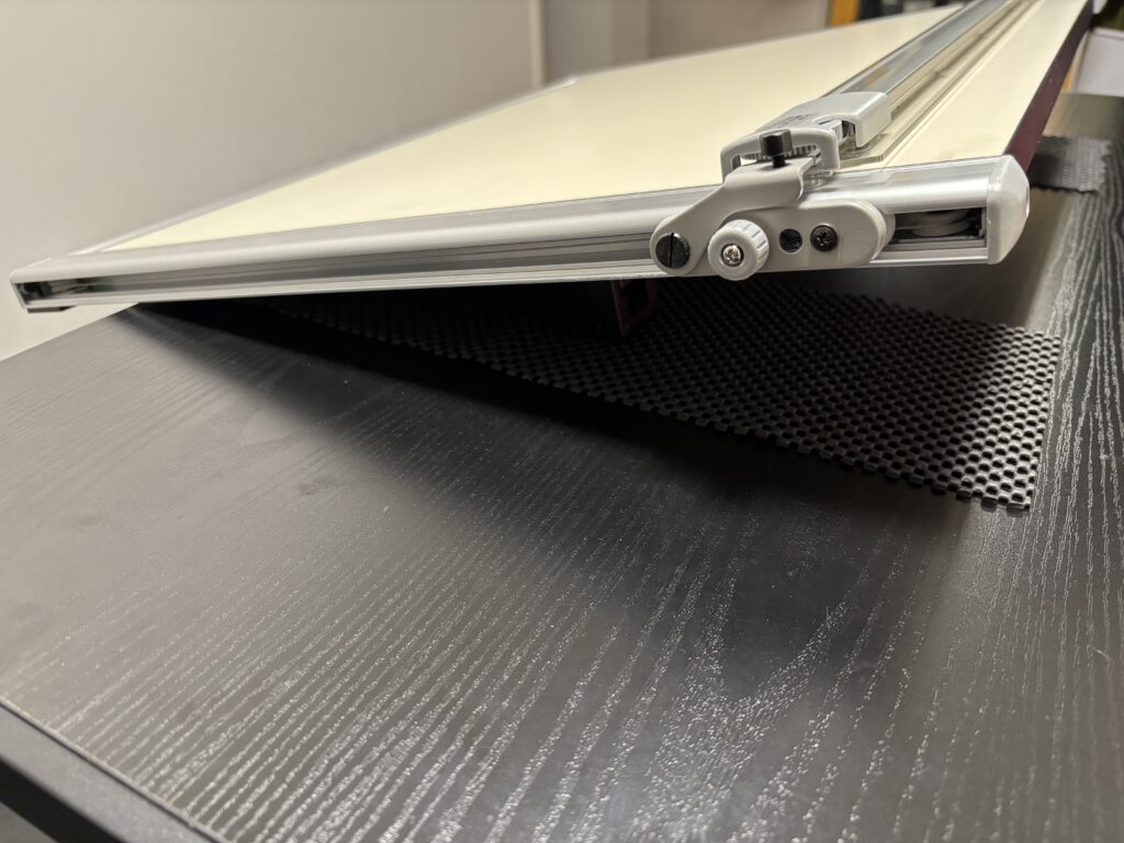 写真のように、滑り止めマットを手前に出してひき、机の手前に製図版を跳ね出すように設置をします。