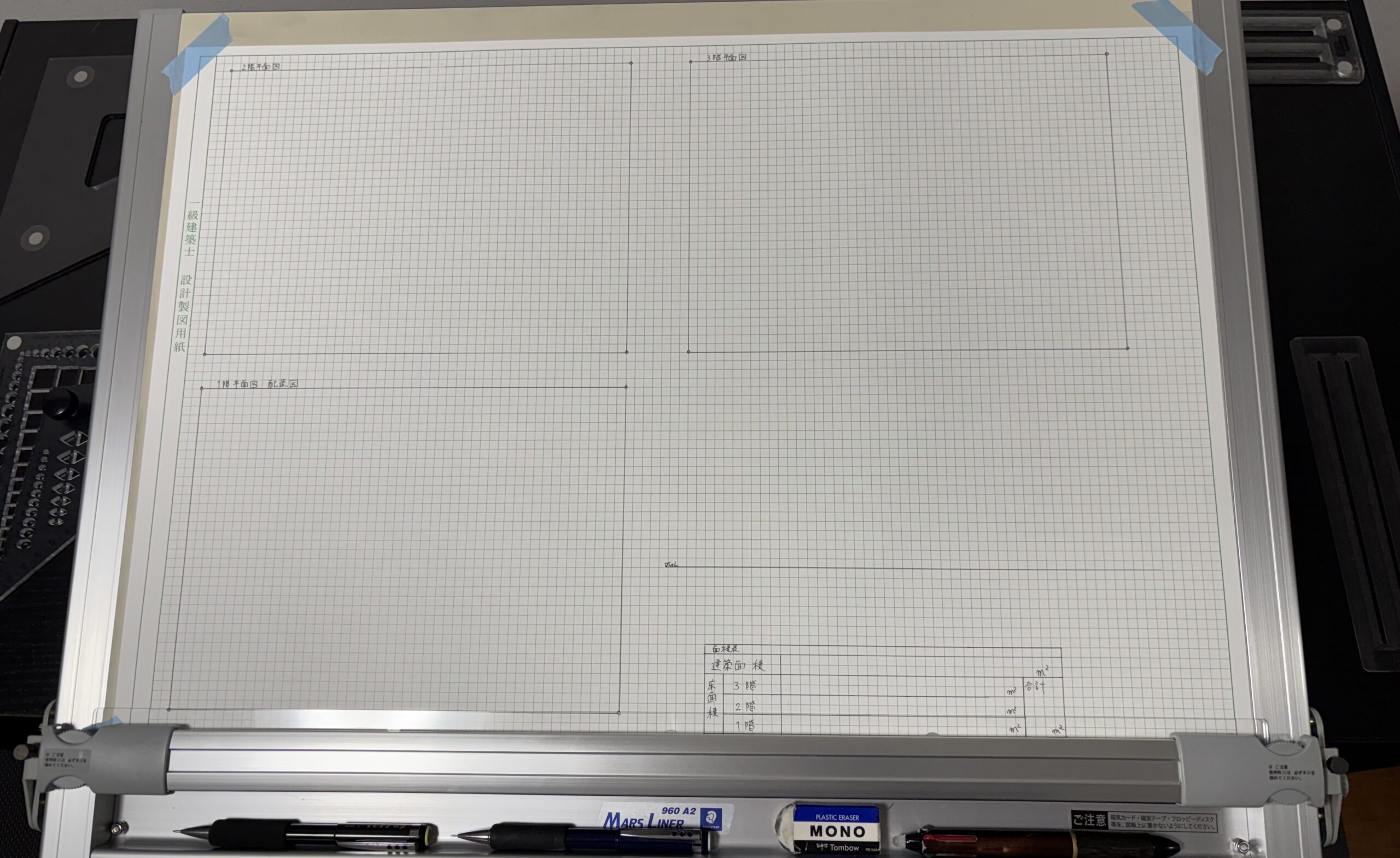 普通に製図版を設置しても奥行き的に机に乗らないような状況です。最悪の環境ですよね。
