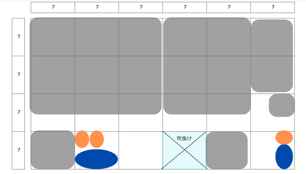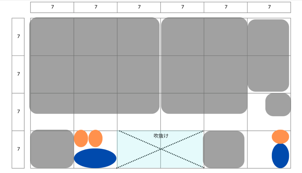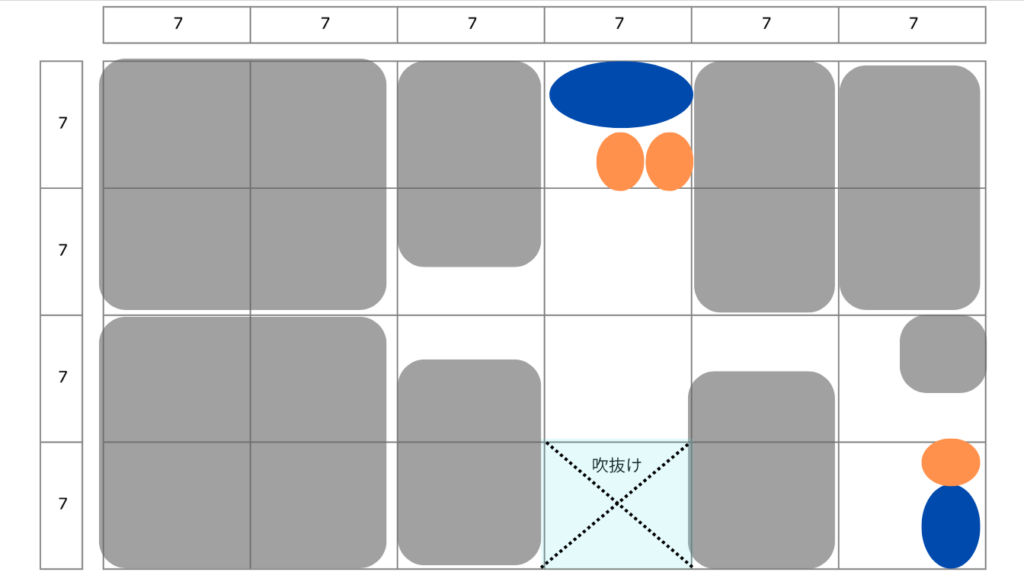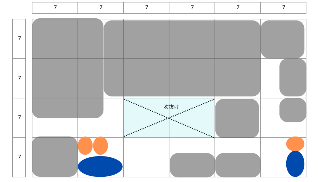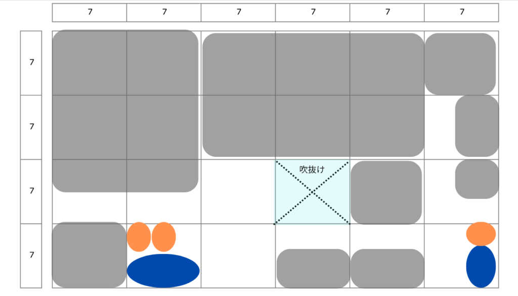 吹抜け指定が求められることもよくあると思いますが、吹抜けの位置によってエスキスの難易度は結構変わります。