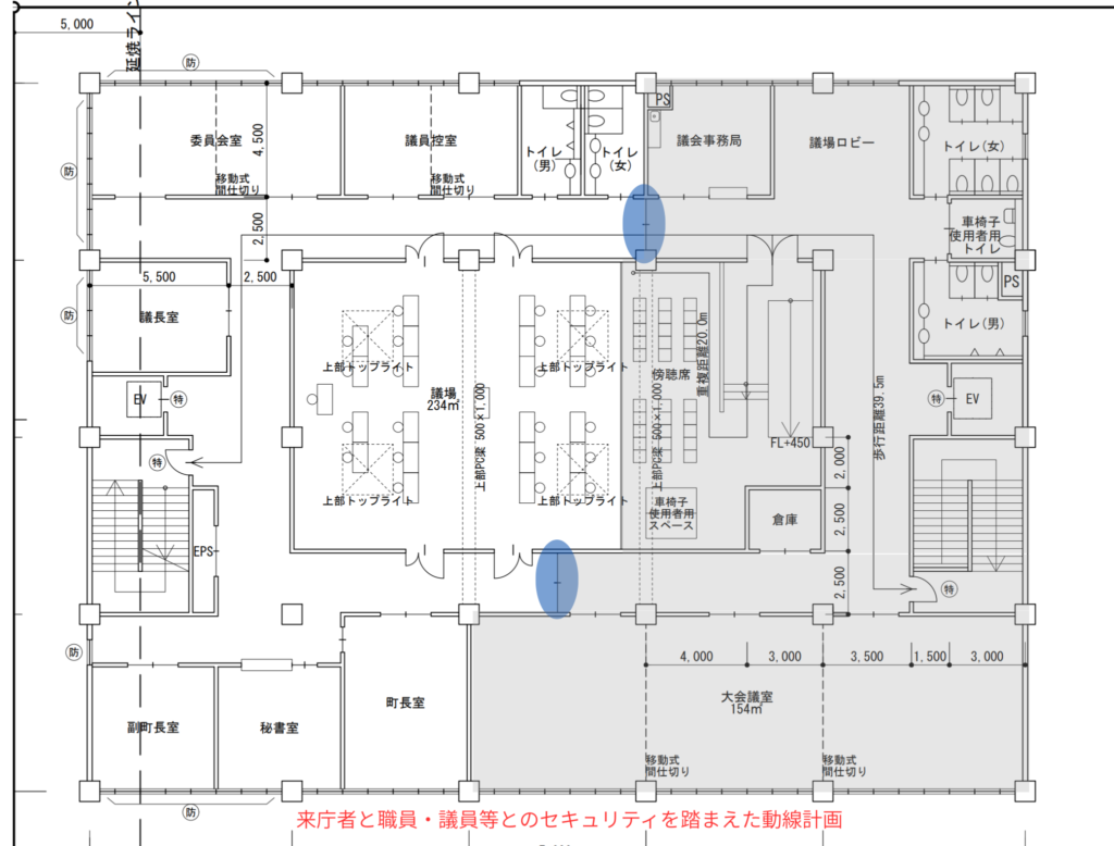 上記は令和7年の標準解答例になりますが、課題文にて『来庁者と職員・議員等とのセキュリティを踏まえた動線計画』と指定があったのでマーキング箇所に扉を設けて動線を分けている例です。